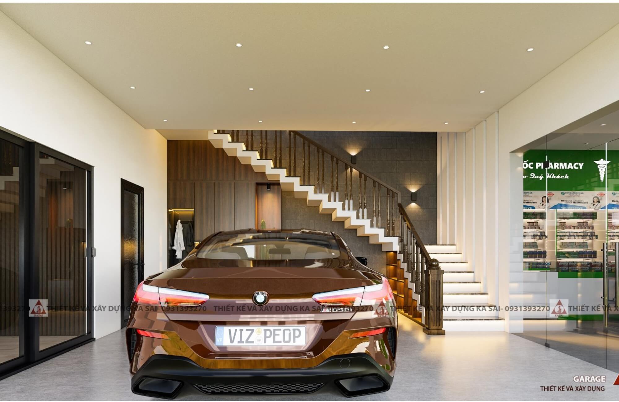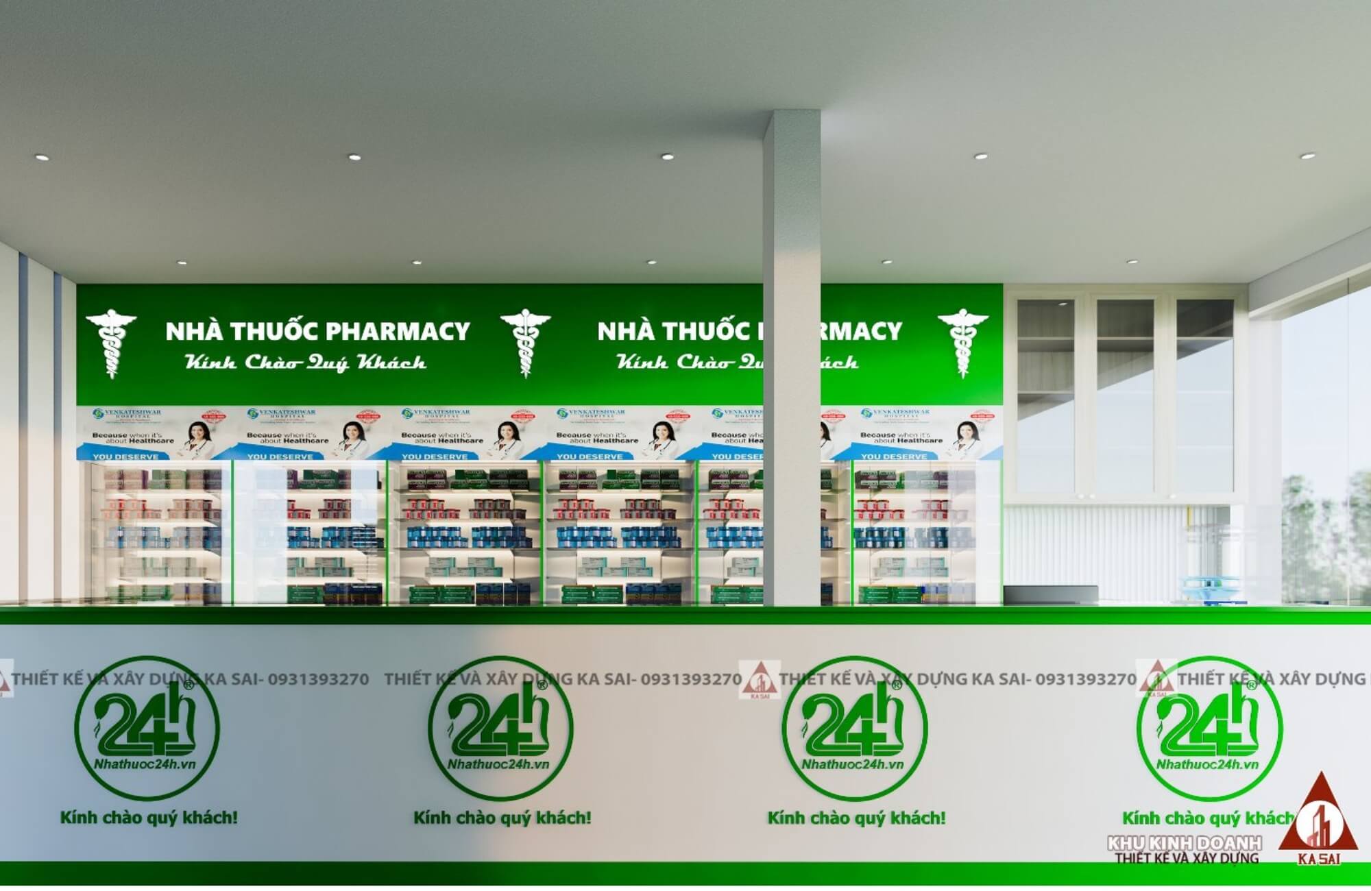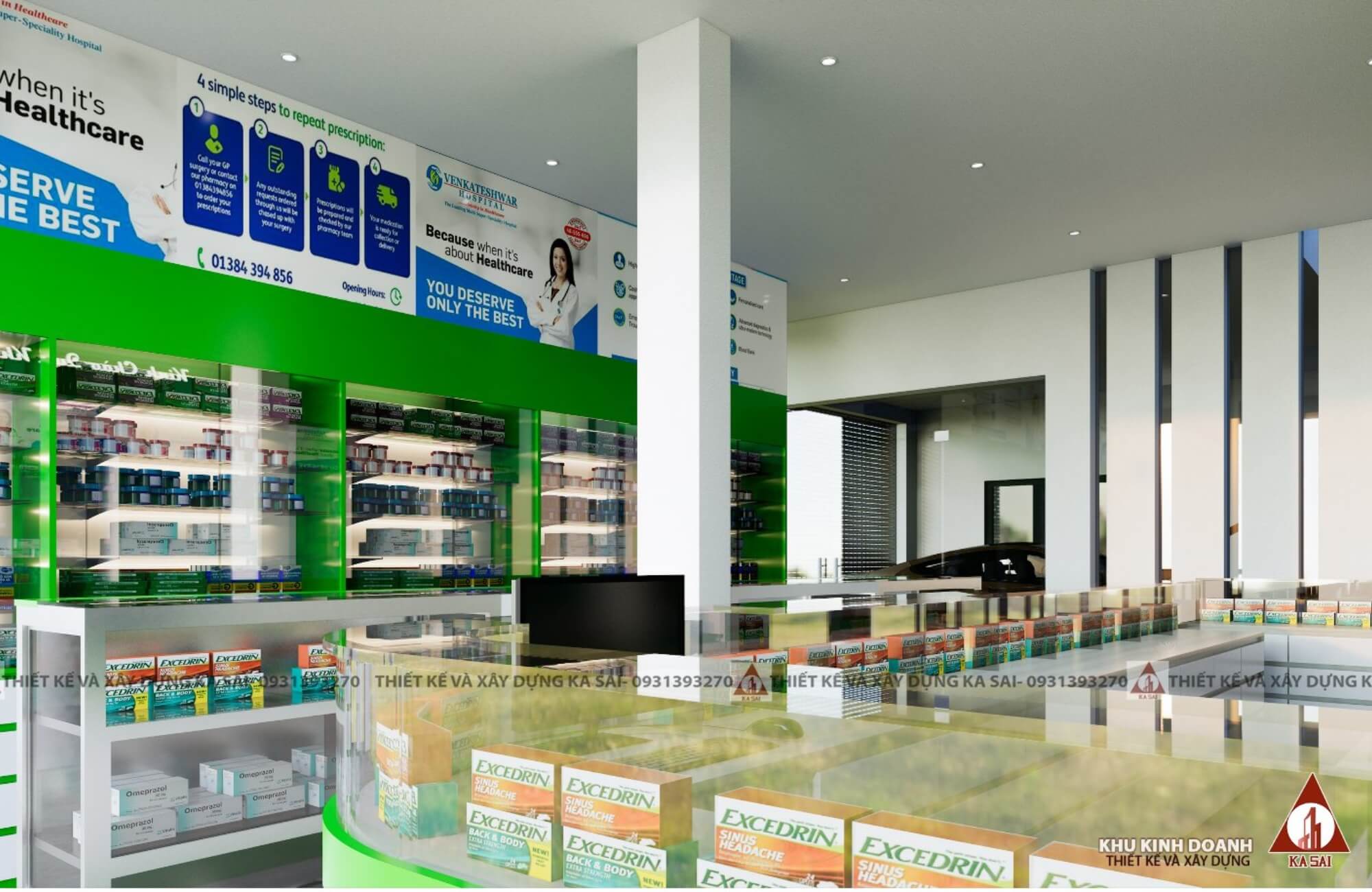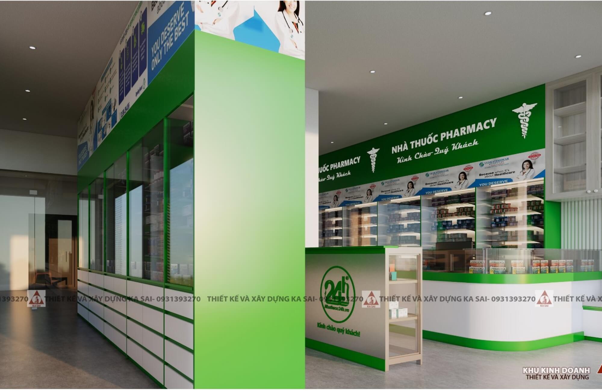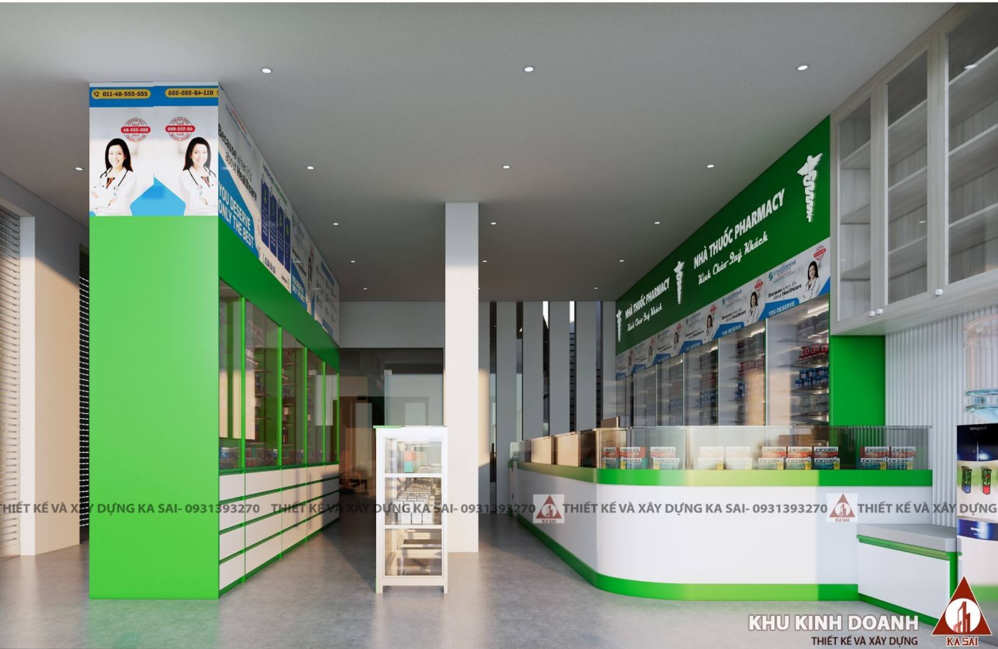 Với nhu cầu kinh doanh nhà thuốc nên phía trước tầng 1 được bố tri không gian rộng rãi cho các quầy trưng bày thuốc của gia chủ. Lối đi rộng rãi, tủ kệ đầy đủ mang đến sự tin cậy cho người dùng.