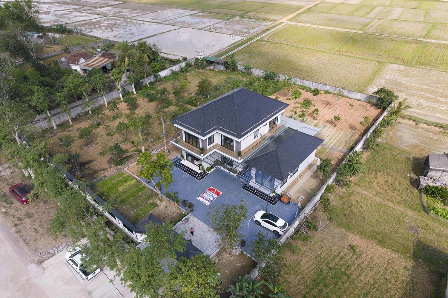 Cùng chiêm ngưỡng những hình ảnh đầu tiên về ngoại thất ngôi nhà biệt thự tại Nghệ An vừa được bàn giao cho gia chủ ngay dưới đây. Có thể thấy biệt thự được xây trong một khu đất siêu rộng rãi, là một nhà vườn hiện đại mà ai cũng sẽ ao ước được sở hữu. Với thiết kế hiện đại cùng tone màu trắng phối mái Nhật xám xanh biệt thự nổi bật giữa không gian sống nơi đồng quê xanh mát.