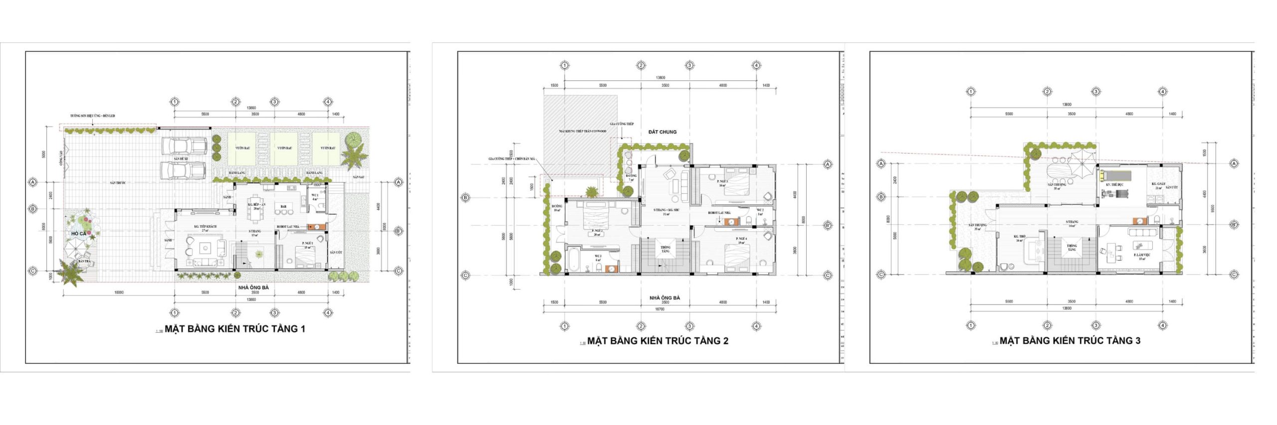Biệt thự được thiết kế với 3 tầng với không gian sân vườn rộng lớn và đầy đủ công năng sinh hoạt. Mặt bằng kiến trúc gồm: