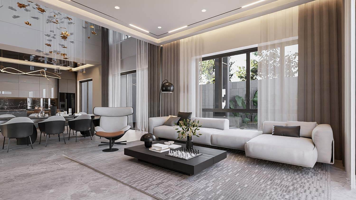 Bên trong biệt thự không gian sống được bố trí cực kỳ khang trang đầy ánh sáng. Với hệ rèm cửa cao cấp cùng lớp kính dày đặt các tầng biệt thự luôn ngập tràn ánh sáng và tiết kiệm điện năng, gần gũi thiên nhiên.