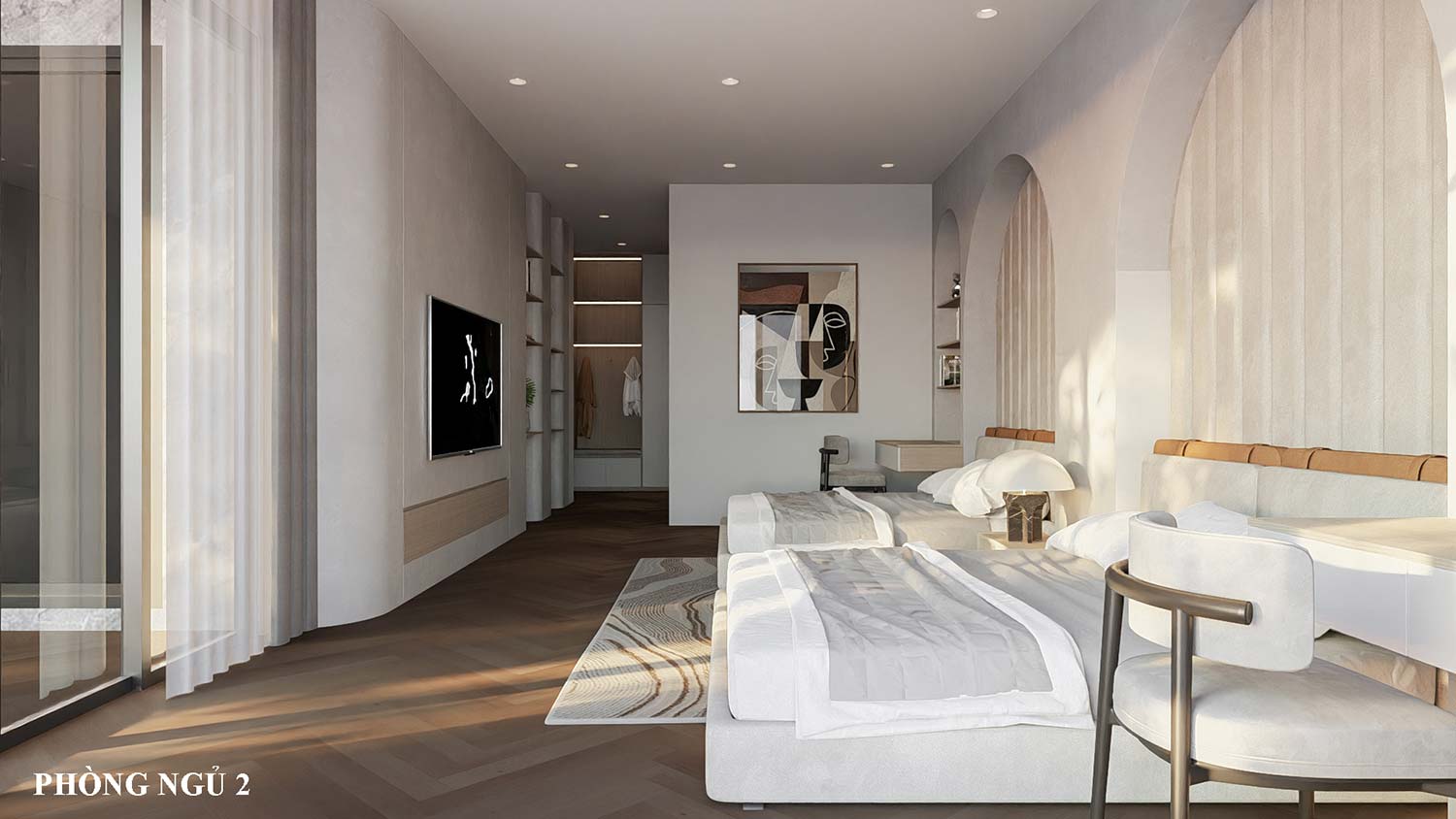 - Tầng 2: Khu vực uống trà, phòng ngủ 1, phòng ngủ 2