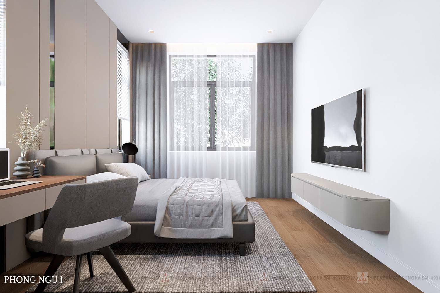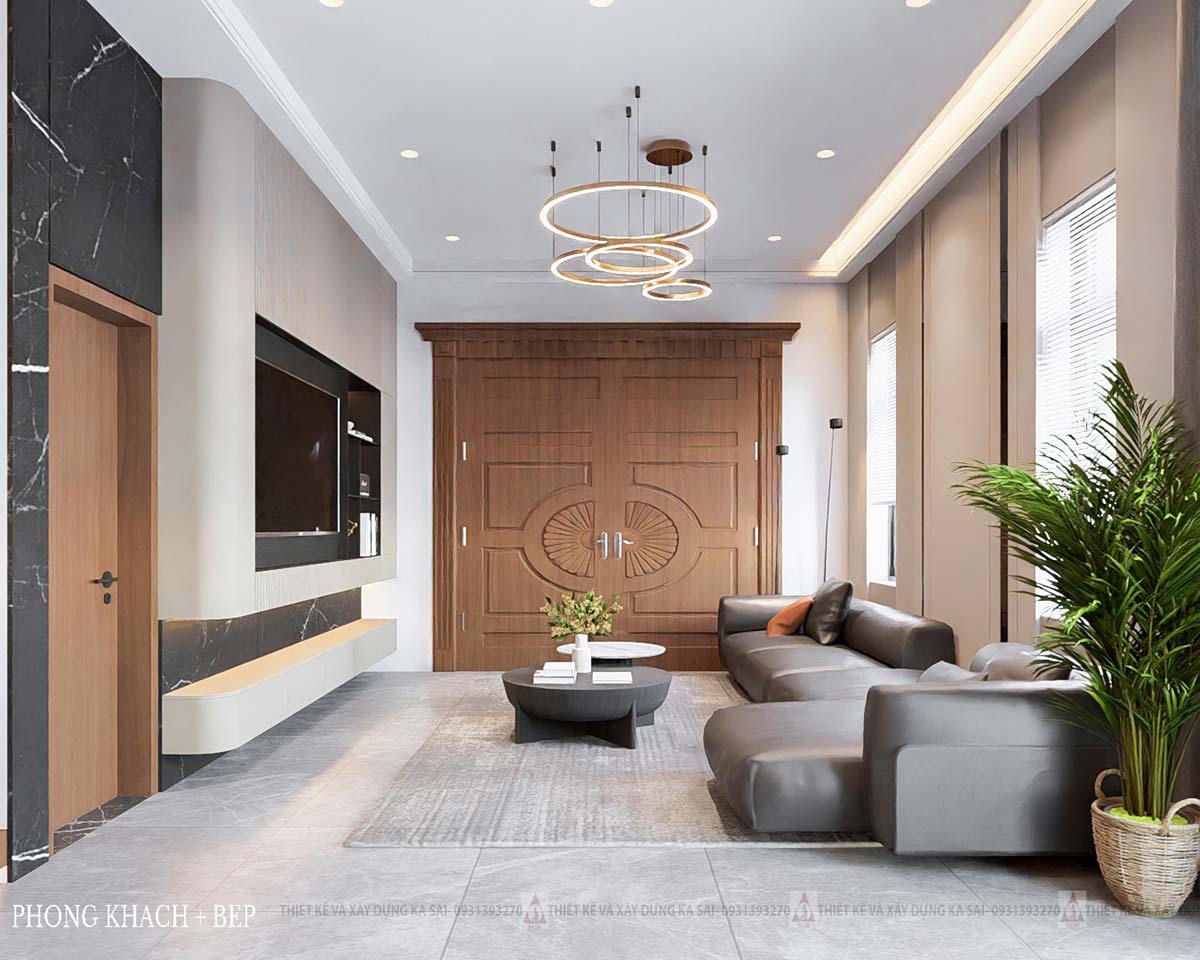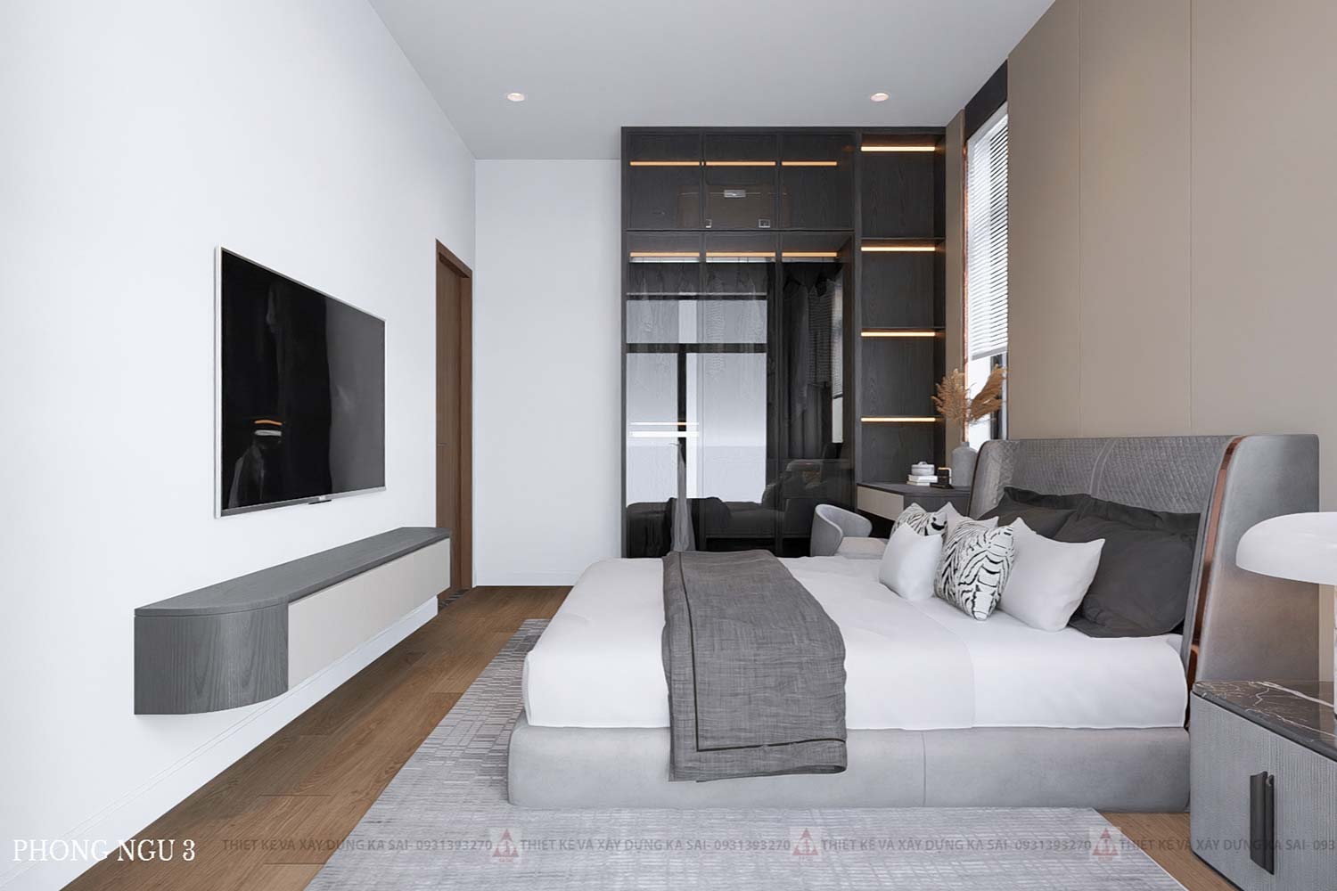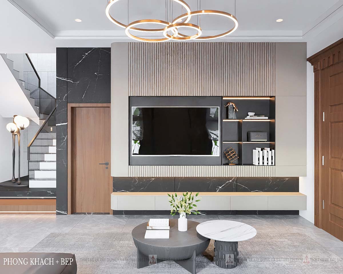 Bên trong biệt thự không gian sống được thiết kế theo phong cách hiện đại với tone màu trung tính ấm cúng mà sang trọng. Không sử dụng các chi tiết rườm rà tân cổ điển, nội thất sử dụng đồ dùng tối giản, nhẹ nhàng mà tinh tế. Giúp cho không gian sống trở nên cực kỳ rộng rãi tiện nghi tuyệt đối.