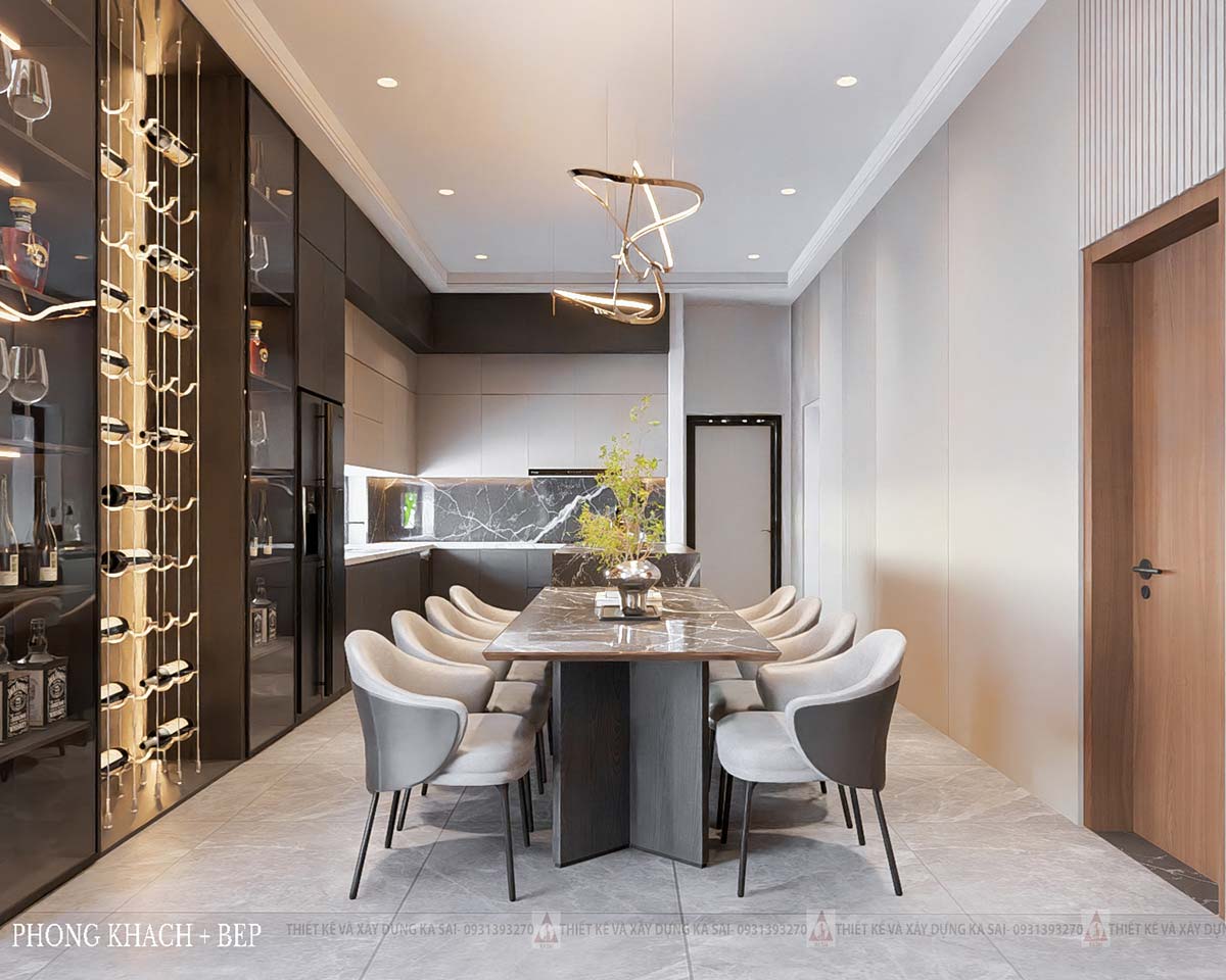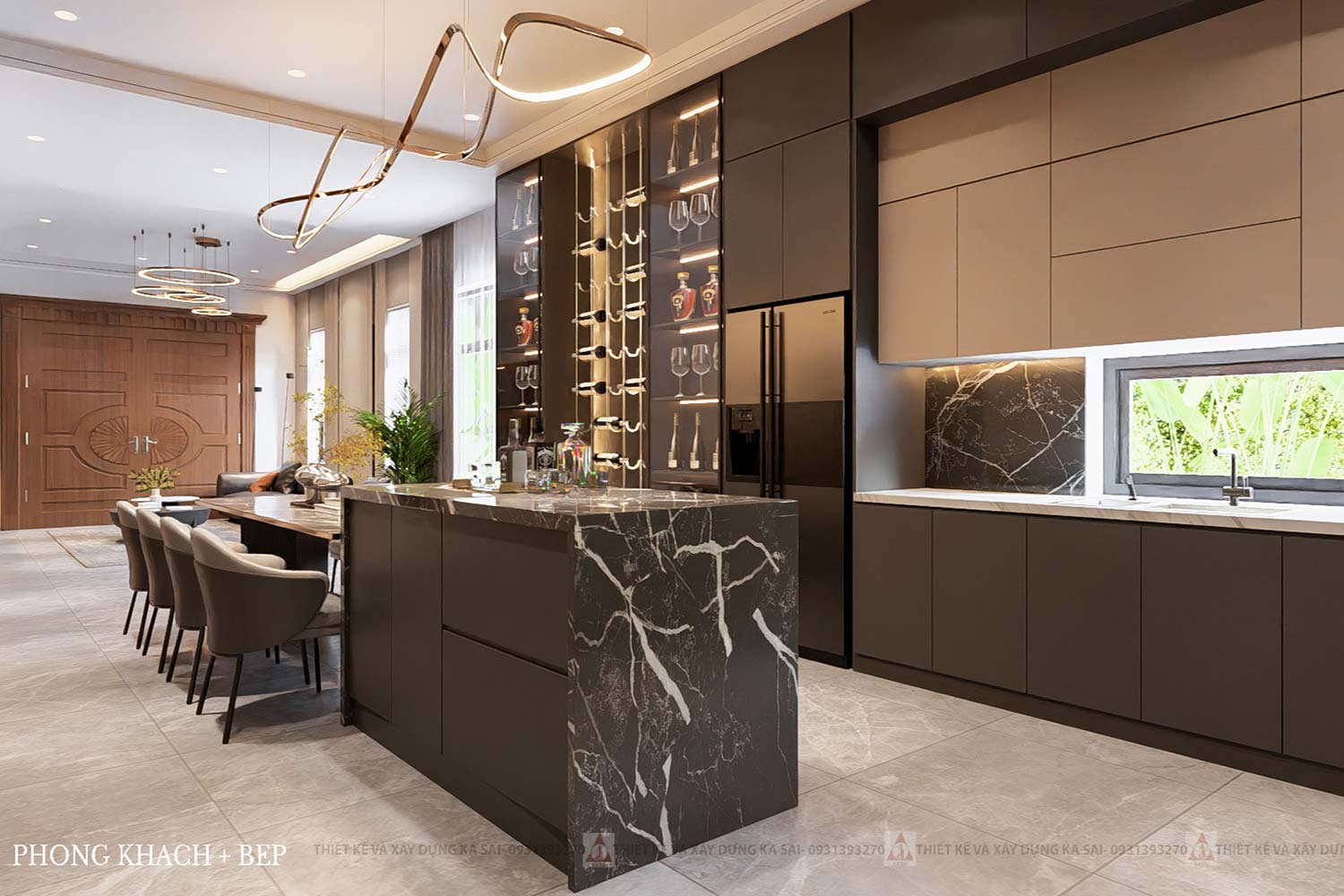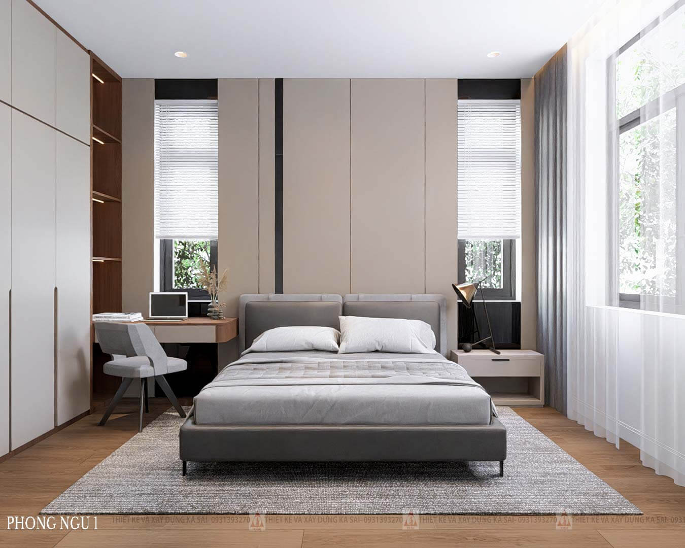 Bên trong biệt thự không gian sống được thiết kế theo phong cách hiện đại với tone màu trung tính ấm cúng mà sang trọng. Không sử dụng các chi tiết rườm rà tân cổ điển, nội thất sử dụng đồ dùng tối giản, nhẹ nhàng mà tinh tế. Giúp cho không gian sống trở nên cực kỳ rộng rãi tiện nghi tuyệt đối.