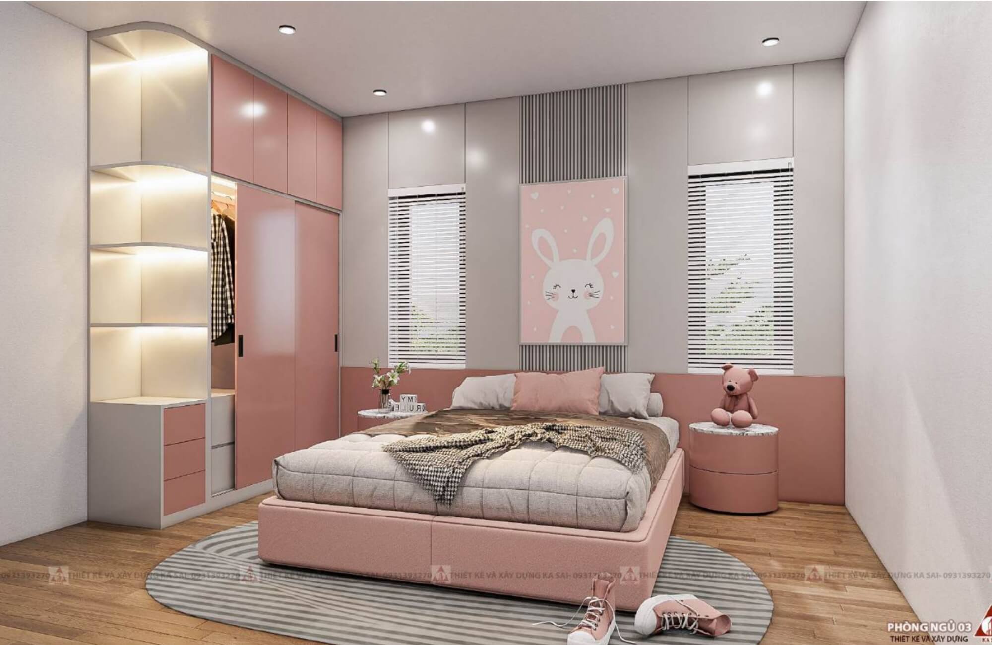 Phòng ngủ cho bé gái được thiết kế với tone màu hồng trắng be xinh xắn. Mảng tường được sơn chân tường, ốp nhựa giả gỗ và tranh ảnh dễ thương