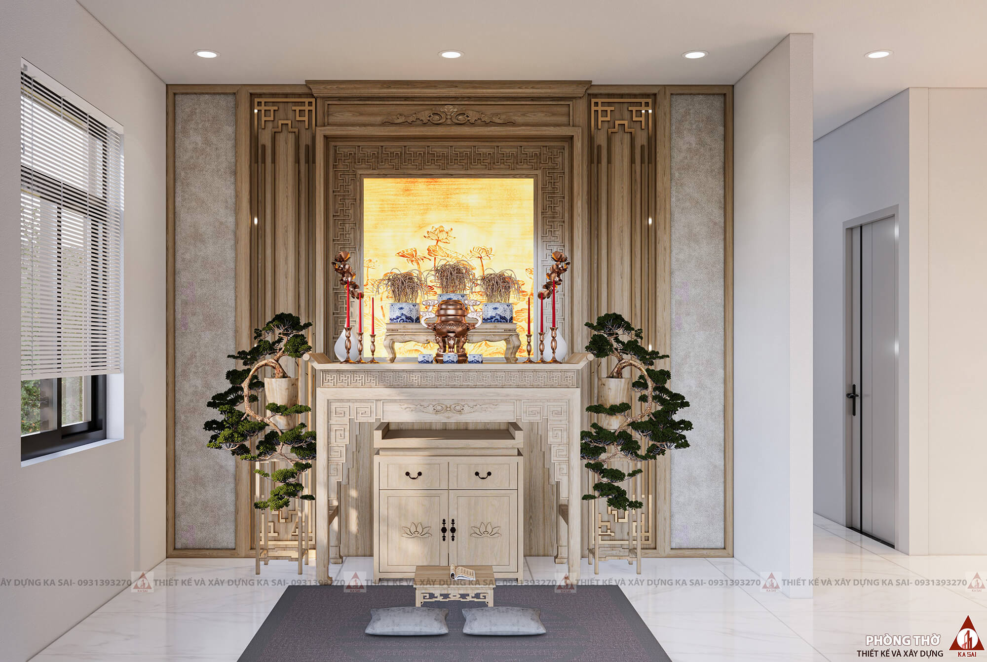 Phòng thờ được bố trí theo không gian mở với thiết kế trang trọng, ấm cúng