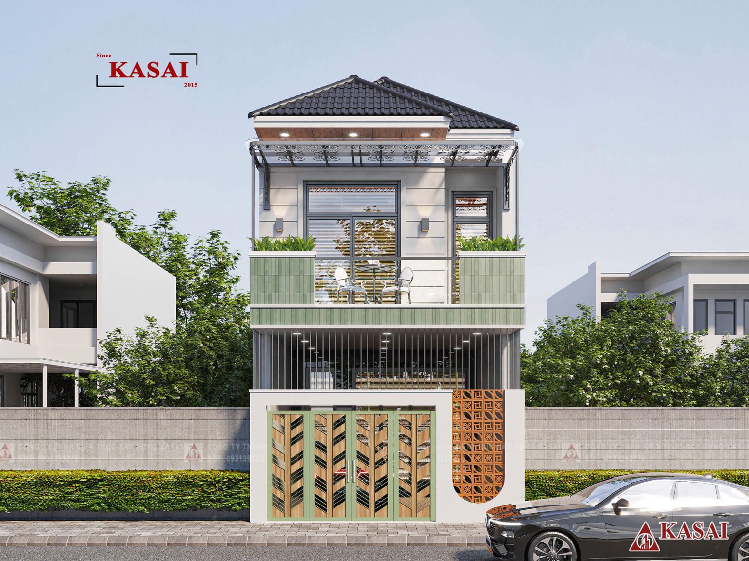 Nếu thích kiểu nhà mái Thái bạn có thể tham khảo mẫu nhà dưới đây được KASAI thiết kế và thi công. Mái Thái giúp ngôi nhà trở nên cao lớn hơn và đầy cảm giác cao cấp.