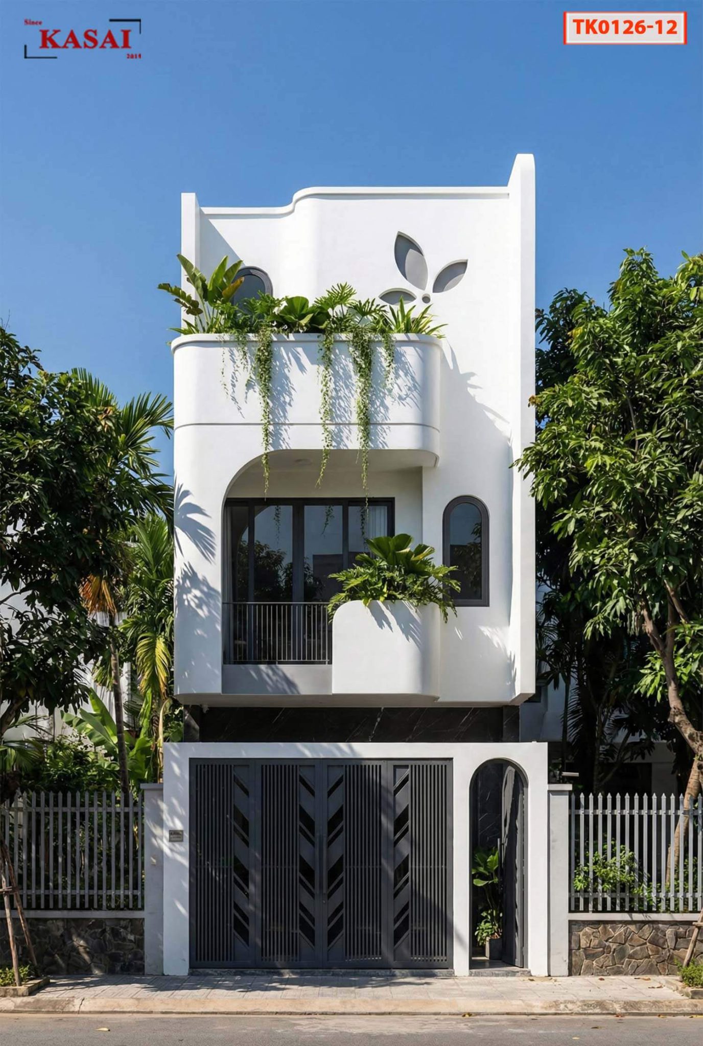 Với tone màu trắng sang trọng kết hợp cùng kiểu bo cong tầng 2 và phần mái sóng lượn, họa tiết lá khắc trên mái. Tất cả những điều này mang đến cho gia chủ một không gian sống vừa kín đáo nhưng cũng rất mát mẻ.
