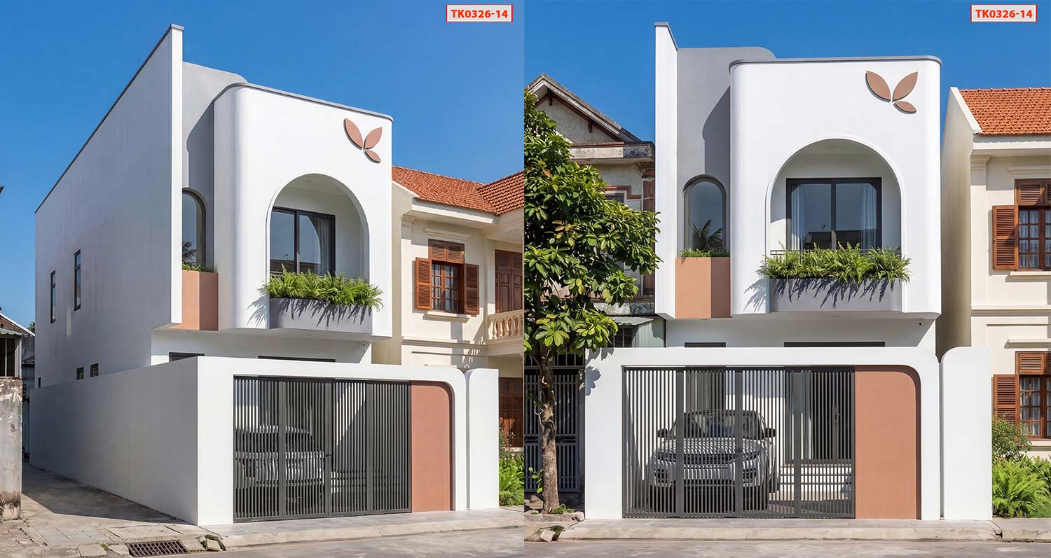 Nhà phố 2 tầng đẹp được nhấn nhá bằng những đường bo cong, vòm cong ở cả cổng lẫn tầng 2. Tất cả tạo nên không gian sống cực kỳ trẻ trung và sang trọng.