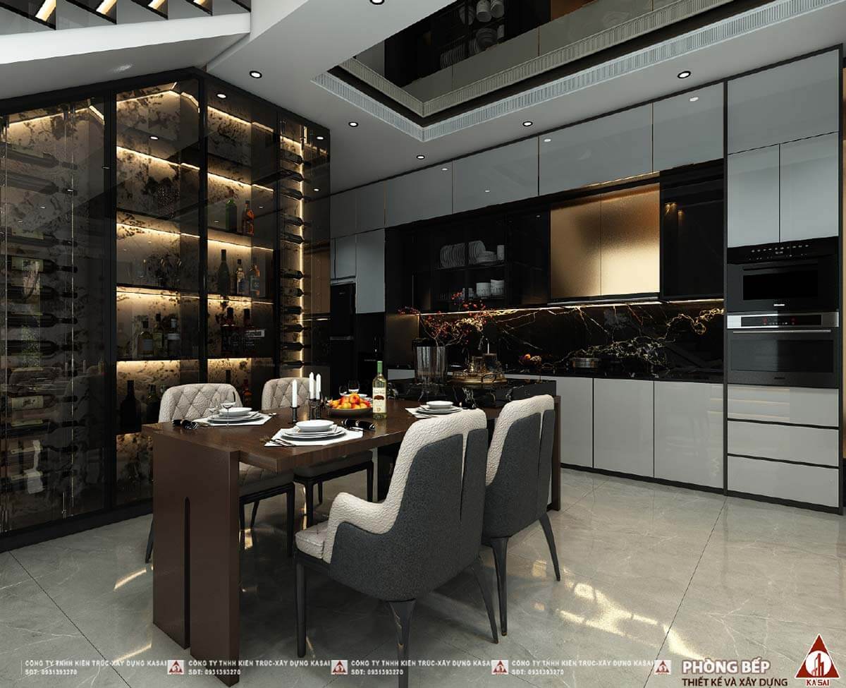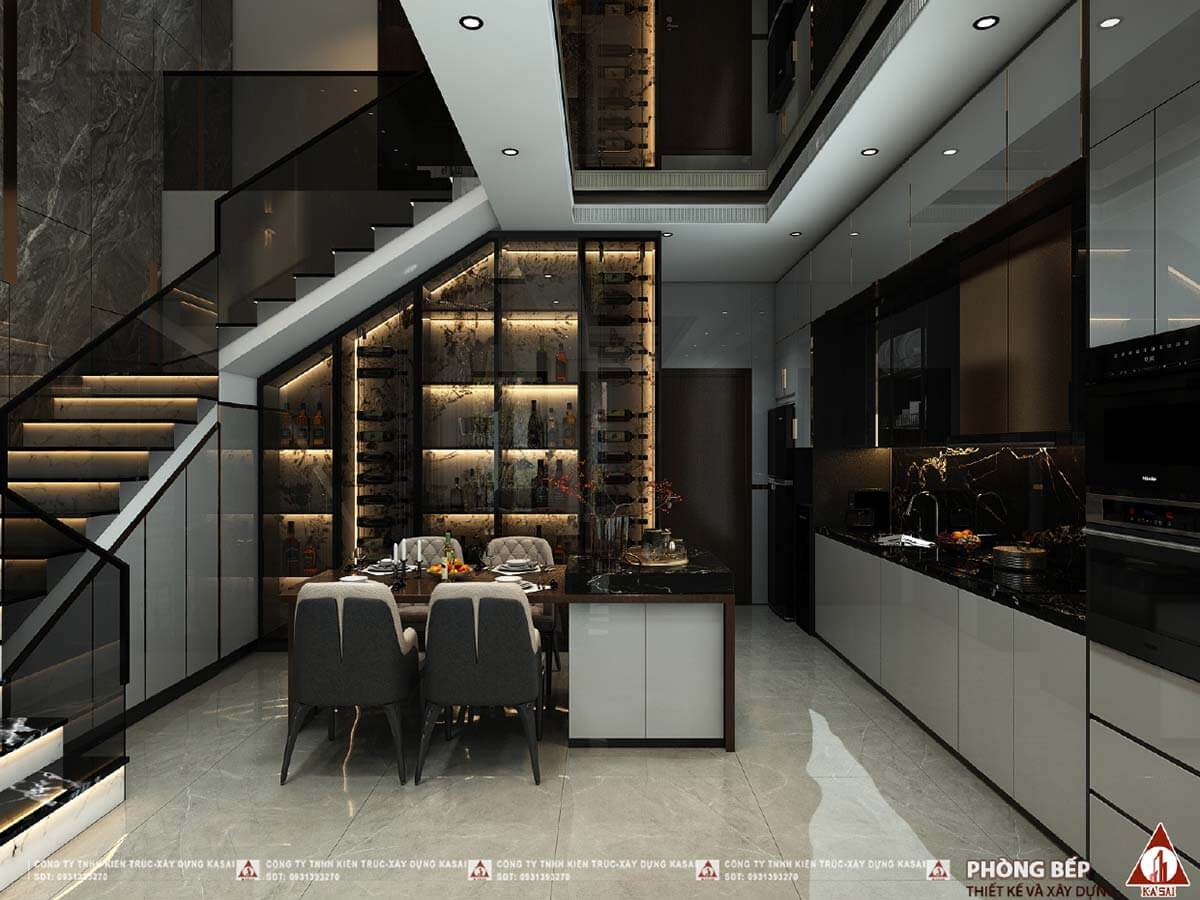 Phòng bếp thiết kế hiện đại với tủ rượu kịch trần