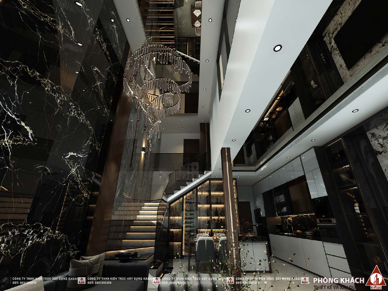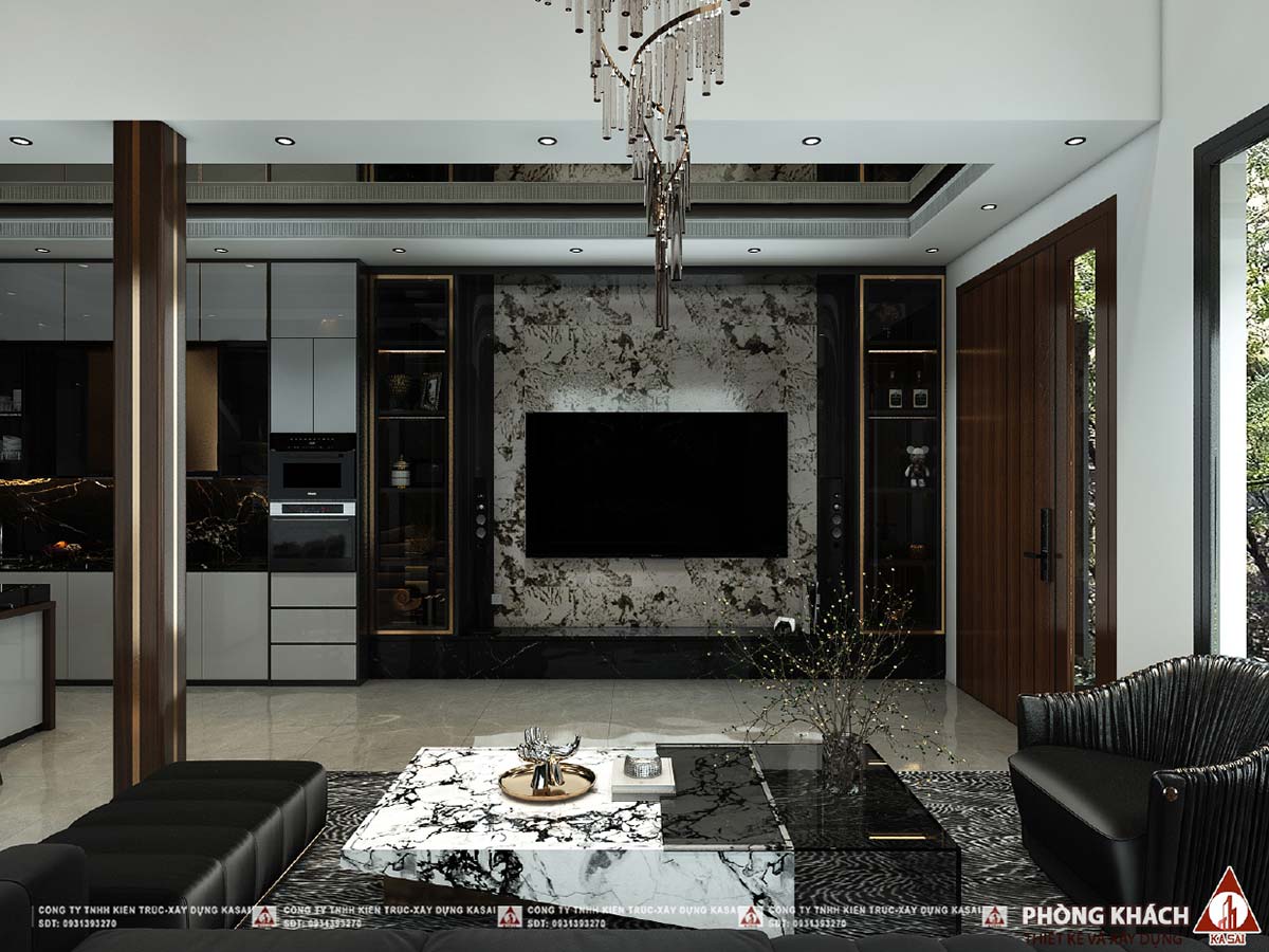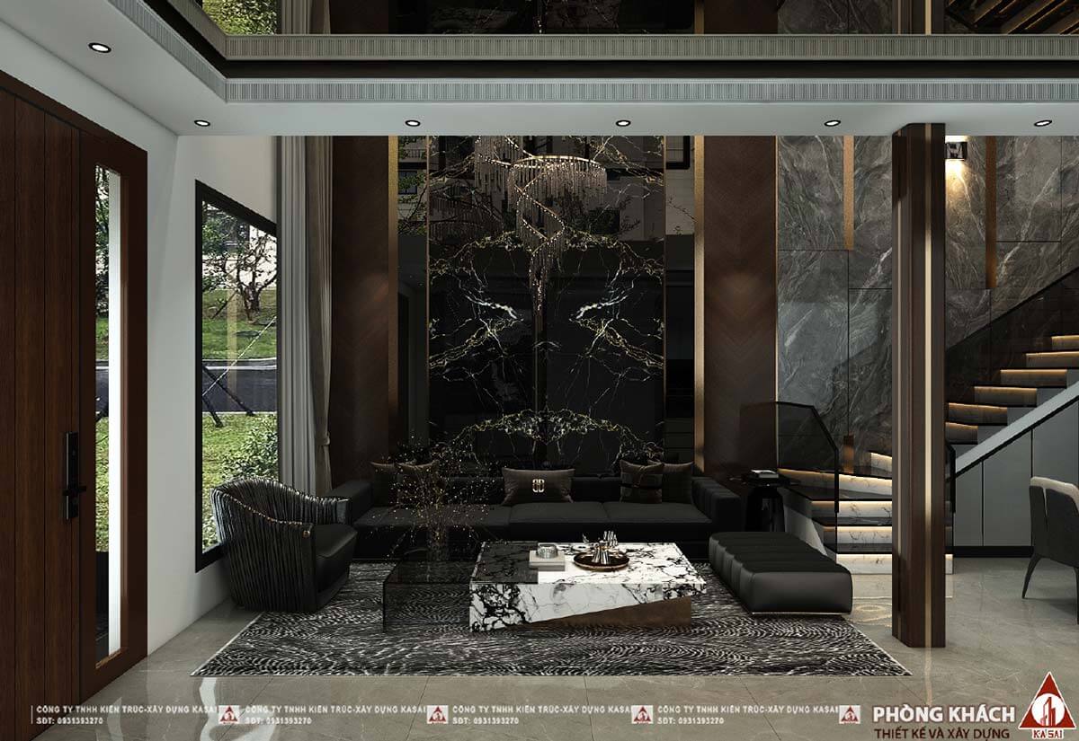 Phòng khách được ốp đá sang trọng với tone màu đen nâu gỗ ấm áp