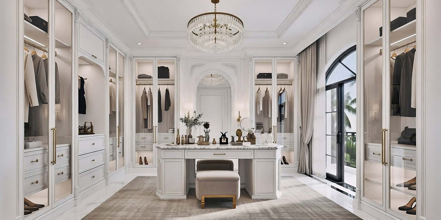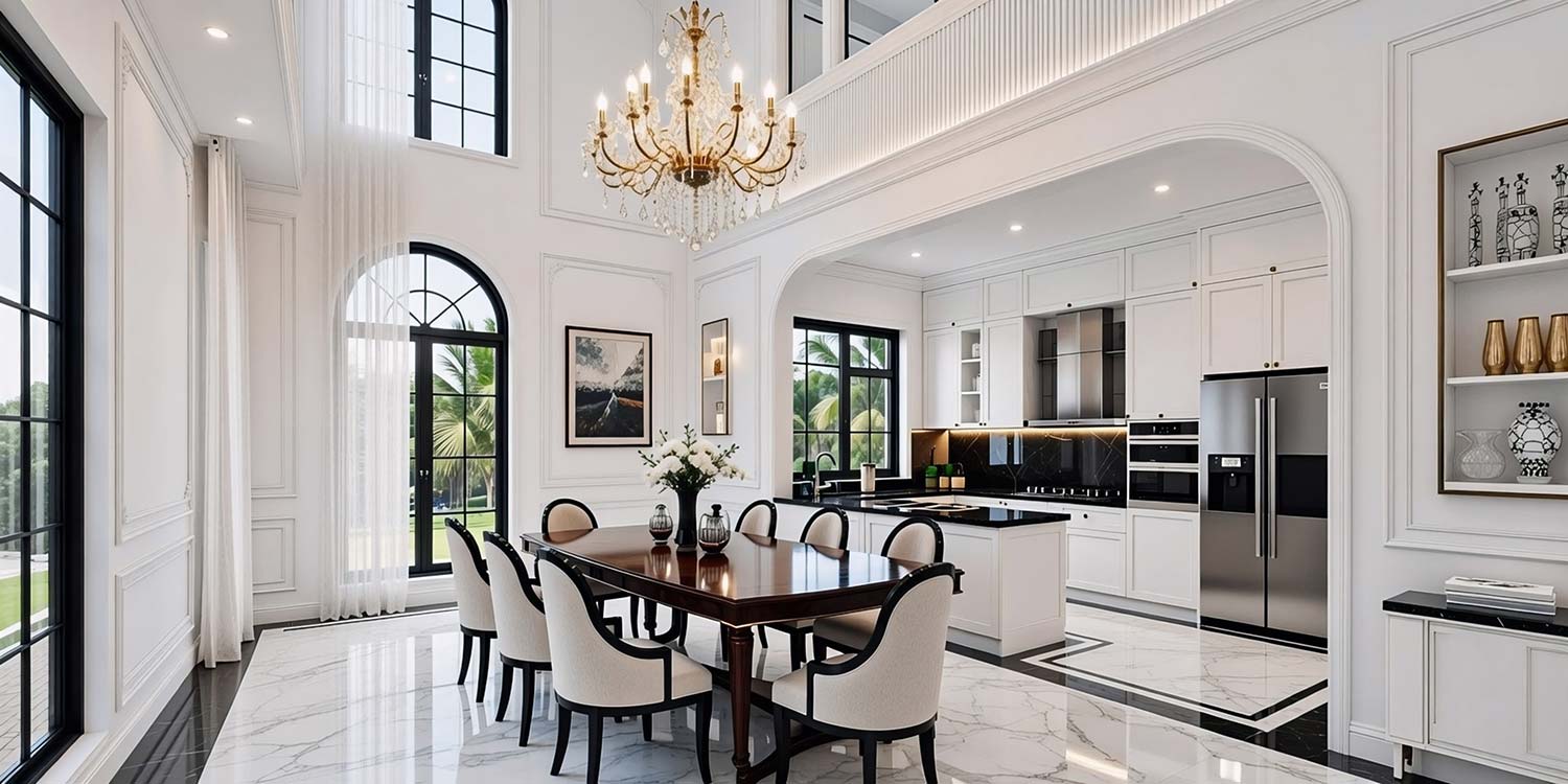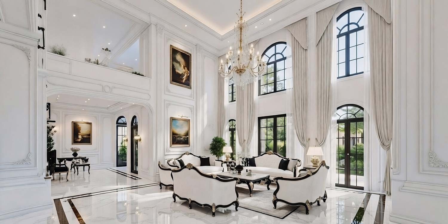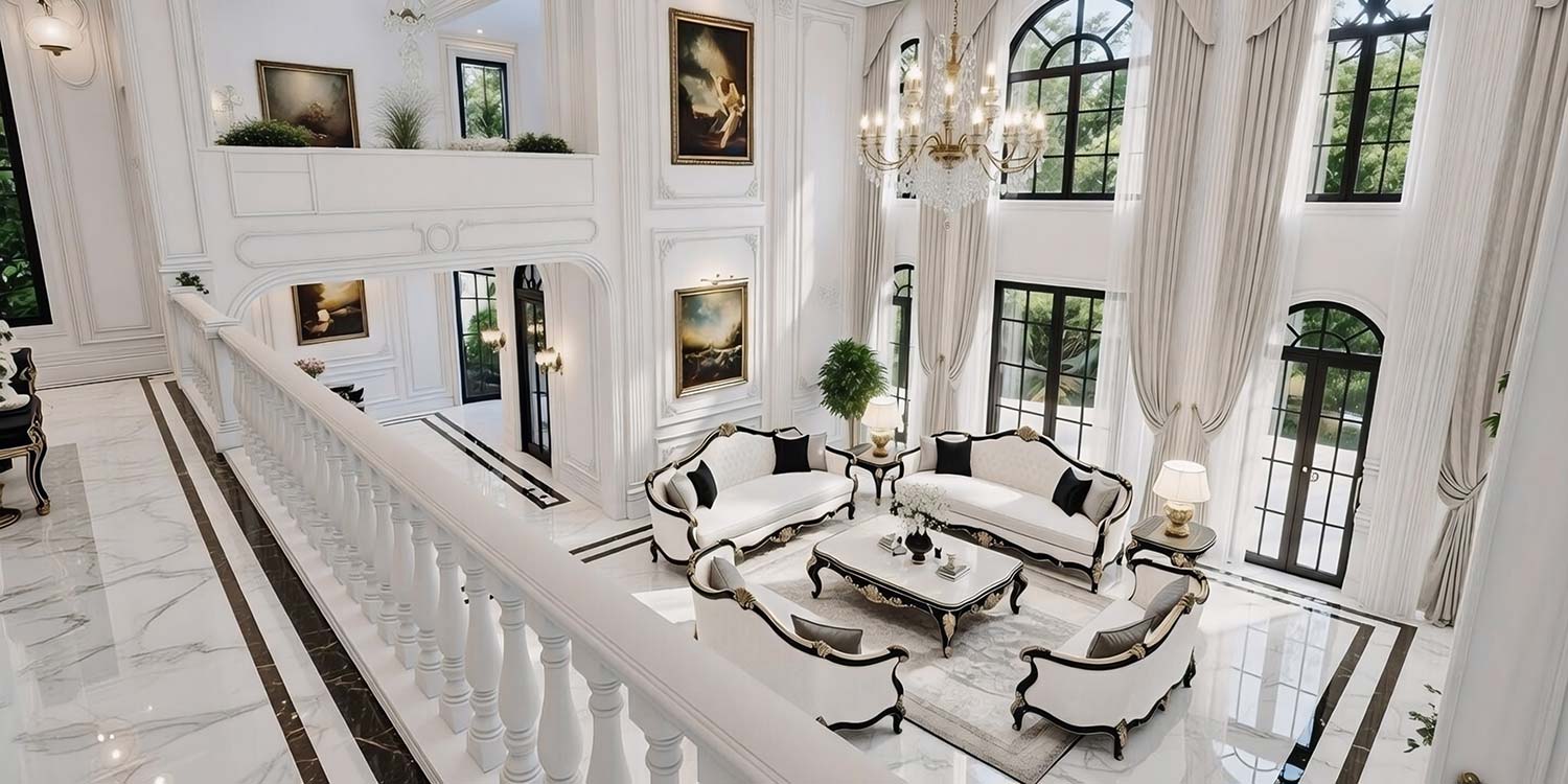 Phong cách tân cổ điển cũng được áp dụng trong cả nội thất bên trong biệt thự mang đến không gian sống siêu sang khiến ai bước vào cũng ngỡ như khách sạn hạng sang,