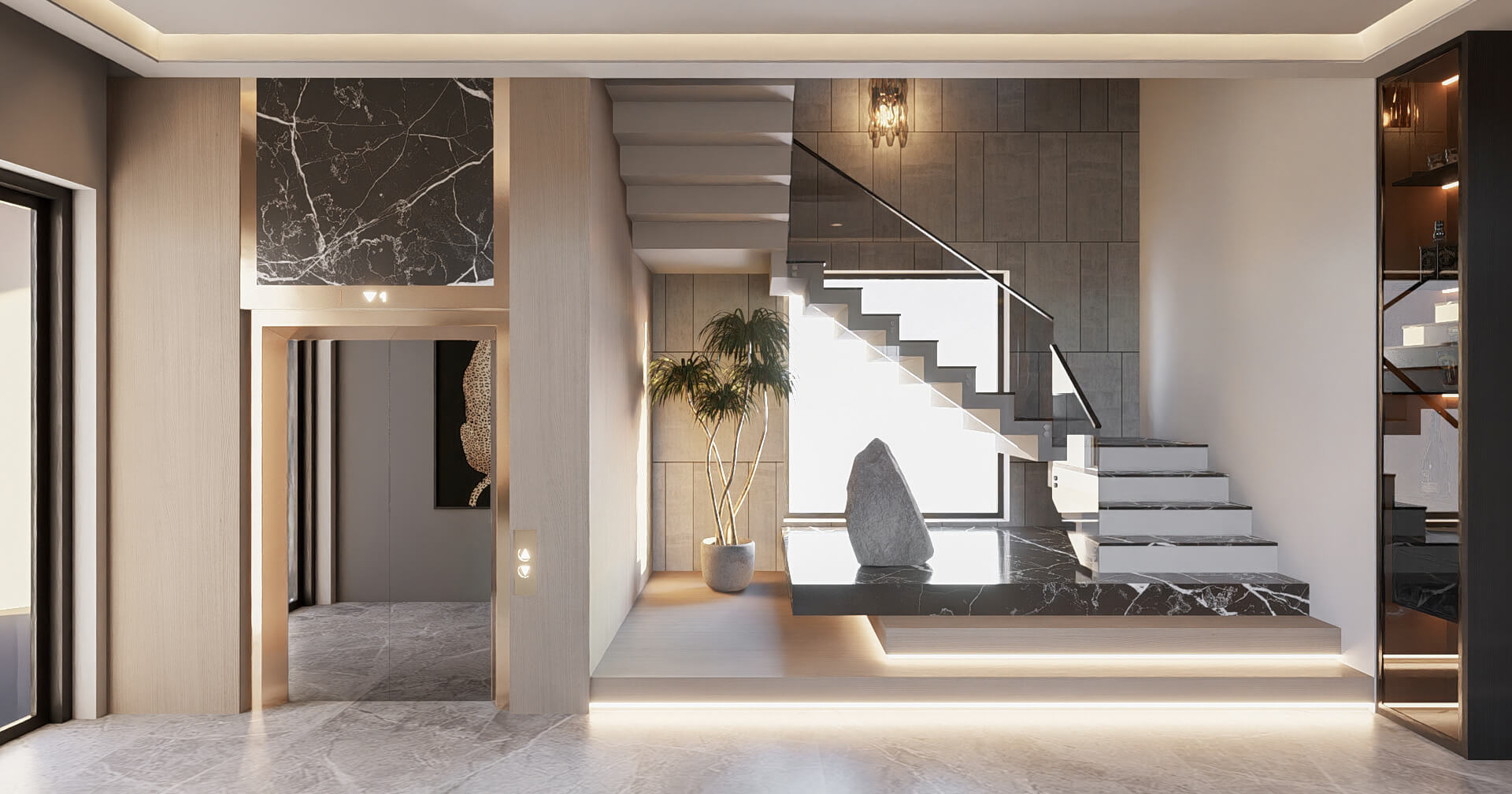 Điểm nhấn nổi bật của biệt thự có tầng hầm là khối giật cấp rõ ràng ở từng tầng. Nếu tầng 1 là khối đặc chắn chắn thì các tầng trên là những khối vươn ra thụt vào xen kẽ rất có nhịp điệu. Cảm giác công trình cao tầng nhưng lại không bị thô cứng mà rất thẩm mỹ thể hiện sự đẳng cấp nhưng không hề phô trương.