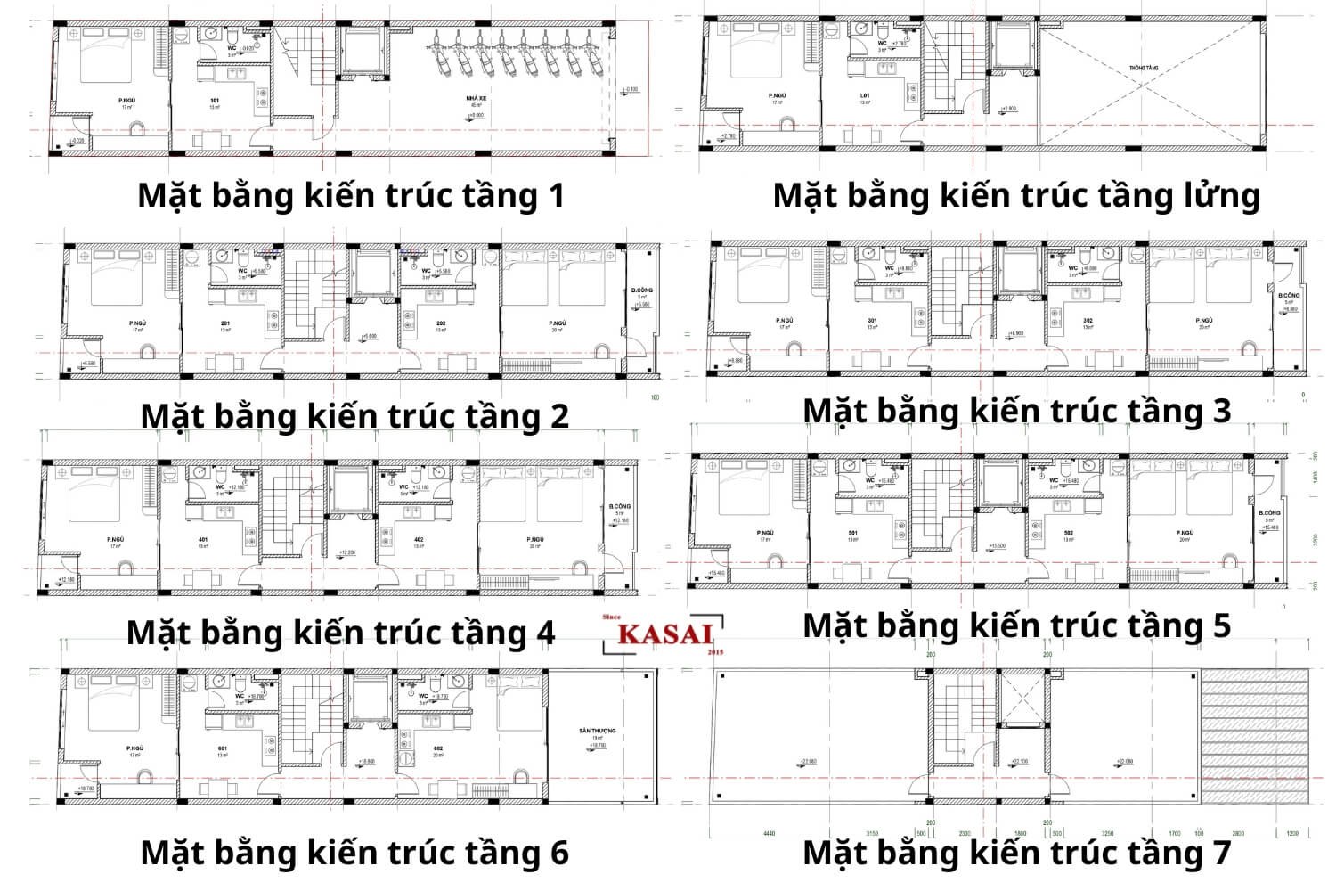Cùng tham khảo bản vẽ mặt bằng căn hộ mini cho thuê 7 tầng 5x20m dưới đây để có thêm ý tưởng cho căn hộ của bạn. Căn hộ này được công ty thiết kế nhà KASAI bố trí với 7 tầng gồm tầng lửng và 6 tầng chính. Trong đó tầng 1 được thiết kế là khu vực gara để xe tiếp khách. Tầng lửng sẽ là được thiết kế thông tầng từ tầng 1 rất thoáng đãng. Các tầng đều bố trí phòng cho thuê tối ưu lợi nhuận cho chủ đầu tư.
