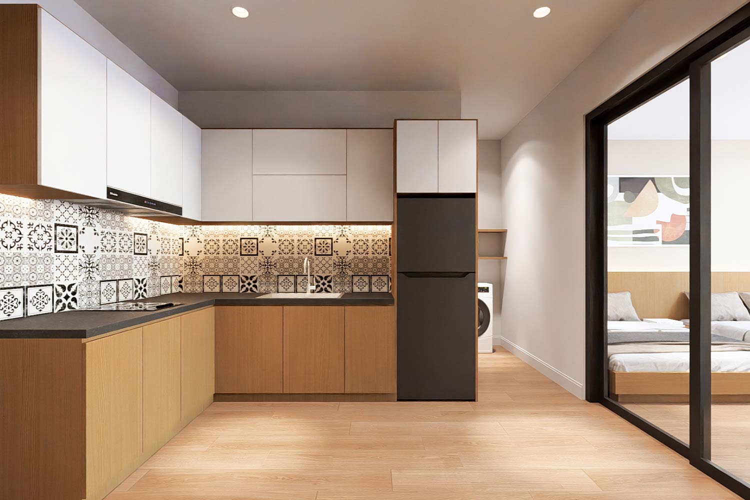 Các căn hộ mini bên trong được bố trí không gian cực hợp lý với diện tích rộng rãi cho khách thuê sinh hoạt. Các tone màu trung tính và trẻ trung được sử dụng rất hài hòa mang đến không gian hiện đại phù hợp cho nhiều đối tượng khách thuê khác nhau.