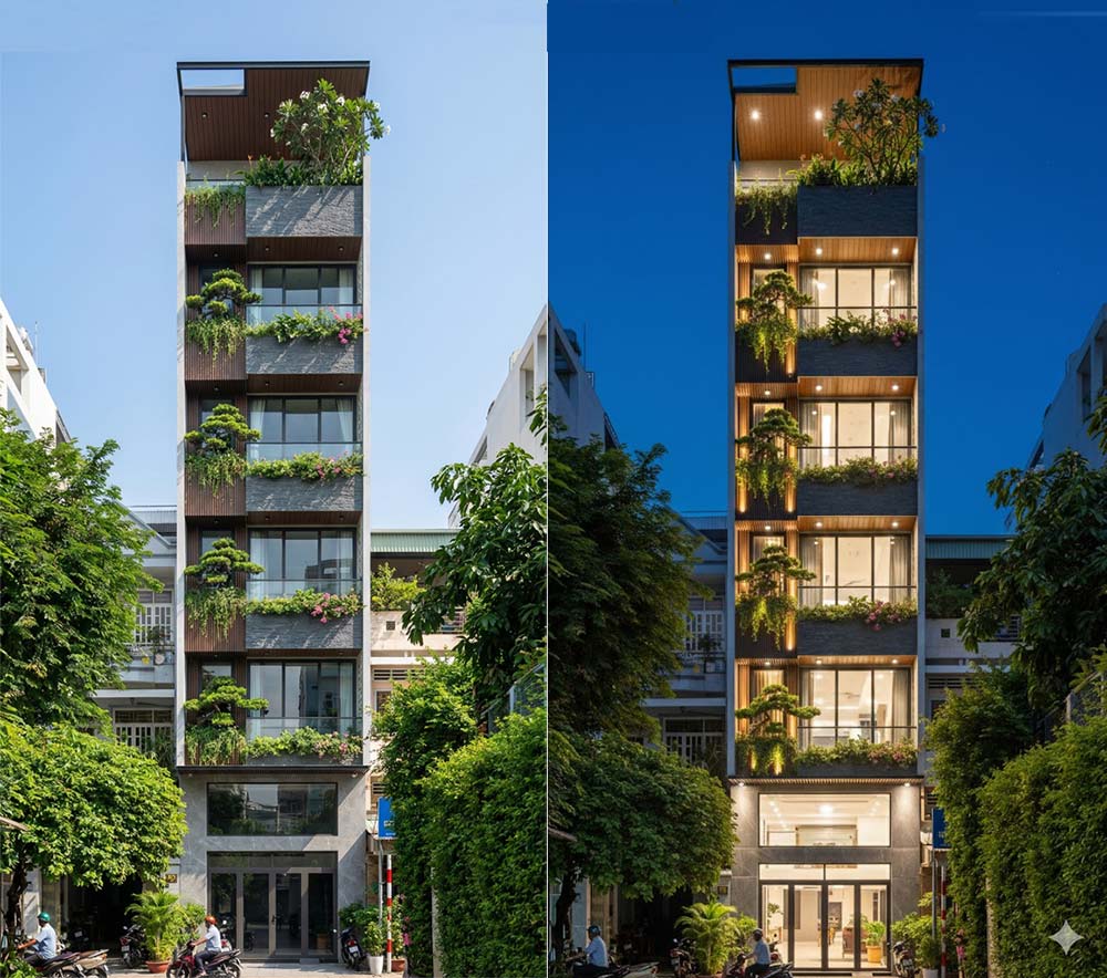 Cây xanh là giải pháp hữu hiệu nhất để giúp không gian sống trở nên trong lành và mát mẻ. Thiết kế chung cư mini 7 tầng với phong cách hiện đại nhiệt đới sử dụng cây xanh trong tất cả các tầng. Cây thuộc dạng cây rủ, bonsai tỉa hình nghệ thuật, hoa giấy nở đẹp từ đó mang đến hiệu ứng vườn treo ngay giữa phố cực thích mắt.